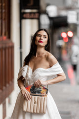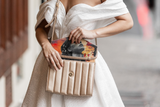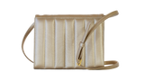 Creating an elegant statement with her expertly crafted, cleaned lined metallic pale gold quilted leather design.
